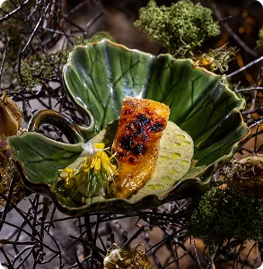 From the rivers, we venture into the dense rainforest. The lights dim to emerald hues as you envision towering trees and a crackling fire under the jungle sky. This course, “Forest,” is inspired by the indigenous practice of cooking with fire and smoke amid nature.